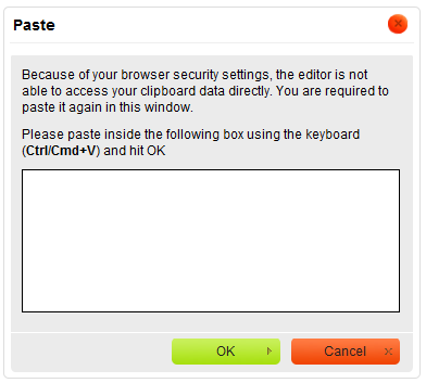 If direct access to clipboard is blocked, you will be asked to paste the text into the Paste dialog window using the Ctrl+V keyboard shortcut.
