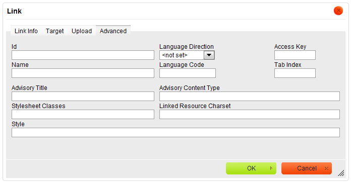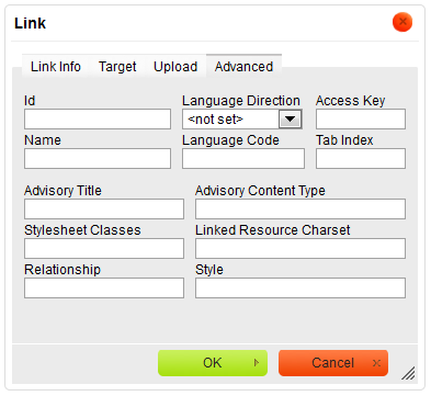 The image below presents a default size of the Advanced tab in the Link dialog window.
