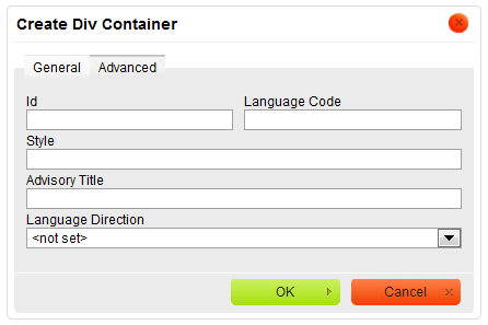 The Advanced tab lets you configure additional div element options such as assign it an ID, a language code, a text direction, a tooltip, or CSS style properties. It is meant for advanced users with knowledge of HTML as well as CSS, and gives nearly endless possibilities as far as the presentation of the div element is concerned.