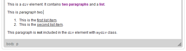 As visible on the elements path, when the cursor is placed in the second paragraph, the hierarchy of HTML elements includes just the html and p elements.
