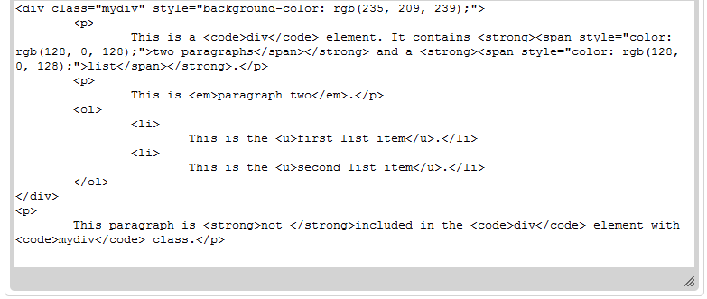 In this example the first two paragraphs and a list were selected, and then placed inside the div container created with the
