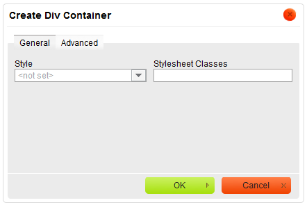 The General tab lets you manually add a stylesheet class that will be applied to the div element. Note that a div element might be assigned more than one class. If this is a case, separate class names with spaces.