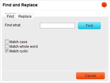 - Match cyclic – checking this option means that after CKEditor reaches the end of the document, the search continues from the beginning of the text. This option is checked by default.