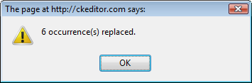 You can also replace all occurrences of the search term in the document in one go. In order to do that, press the Replace All button. CKEditor will then replace all occurrences in the whole document at once and display a pop-up window with the result of the operation.