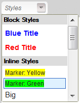 toolbar button. The Styles drop-down list contains a number of pre-defined block and inline styles that you can use. To make the choice easier, the style names are displayed in a style that they represent, giving you a preview of what the text will look like.
