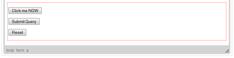 The figure above shows three buttons added to a form. The first one is a Button type with an arbitrary text, the second one is a Submit type submitting the form to the server, and the third one is a Reset type resetting the form input fields to their initial values.