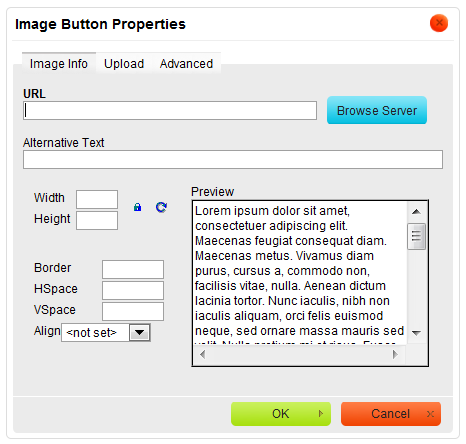 The Image Button Properties dialog window includes three tabs that group image button options: Image Info, Upload, and Advanced. Since the configuration options for an image button match the settings for normal images inserted into documents, please refer to the Inserting Images section of the User's Guide.