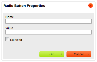 toolbar button. The Radio Button Properties dialog window that will open lets you set the name and value of a radio button as well as decide whether it should be selected by default.
