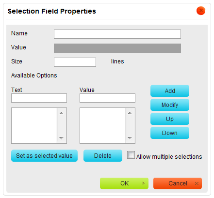 toolbar button. The Selection Field Properties dialog window that will open lets you set the name of a selection field as well as the number and content of available options.