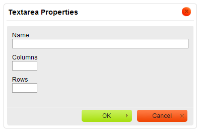toolbar button. The Textarea Properties dialog window that will open lets you set the name and size of a textarea.
