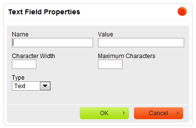 toolbar button. The Text Field Properties dialog window that will open lets you set the name, value, type, and size of a text field.