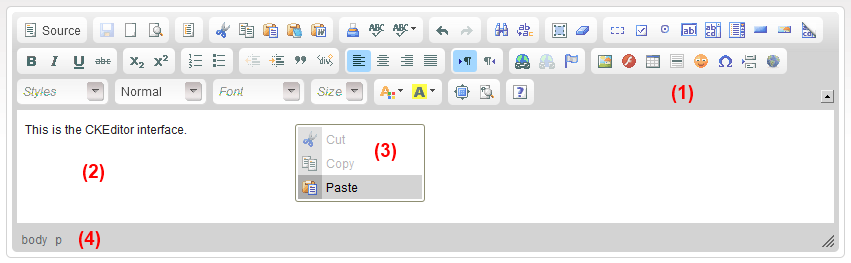- Toolbar (1) – the section at the top of the editor containing grouped menu buttons that give you access to various functions of CKEditor.