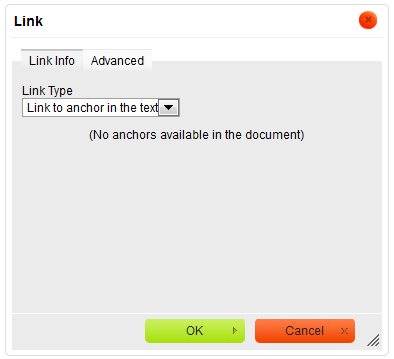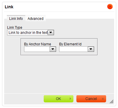 When you choose this link type, two Link dialog window tabs will become available: the Link Info tab and the Advanced tab.