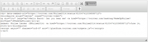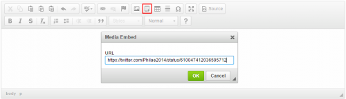Media Embed button is used to insert media links directly in the editor. It allows you to embed resources (videos, images, tweets, etc.) hosted by other services (called the "content providers") in your page.
