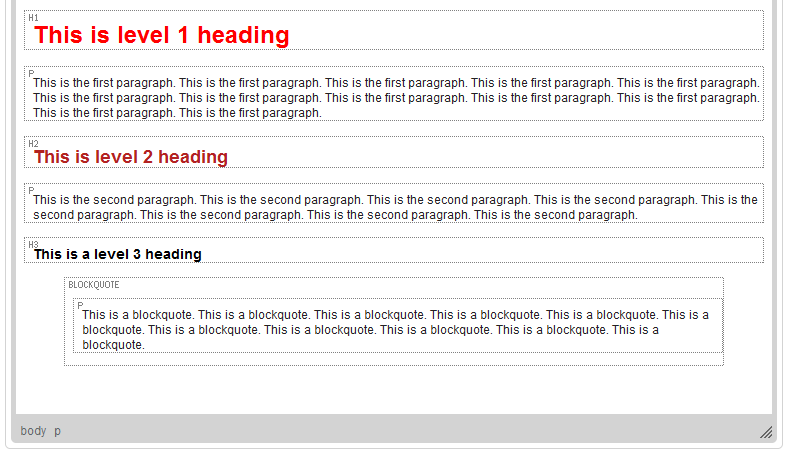 toolbar button, CKEditor will display a grid of dotted frames around the block-level elements of the document along with their HTML tag, like p for paragraph or h1 for level 1 heading, as shown in the figure below.