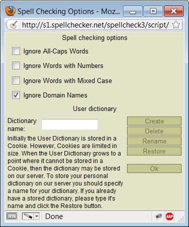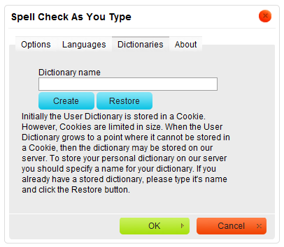Dictionaries store items added to the spellchecker by the user. Initially the user dictionary is stored in a cookie of your browser. However, cookies are limited in size. When the user dictionary grows to a point where it can no longer be stored in a cookie, the dictionary may be stored on the WebSpellChecker.net server.