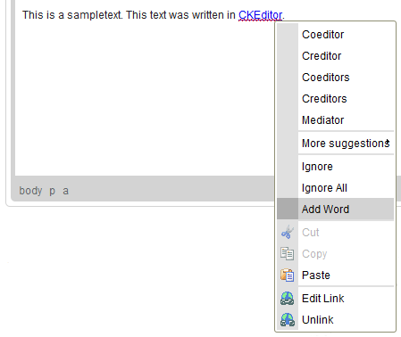 Since "CKEditor" is a valid proper name that we are bound to use more often, we may add it to our user dictionary in order to avoid marking the word as error in the future. To do this, place the cursor anywhere inside the phrase, open the context menu, and select the Add Word option.