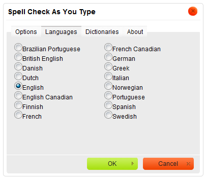toolbar button and select the Languages menu option. The Languages tab of the Spell Check As You Type dialog window that will open lets you select the text language.