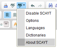 To get more information about the Spell Check As You Type solution, select the About SCAYT option from the menu.