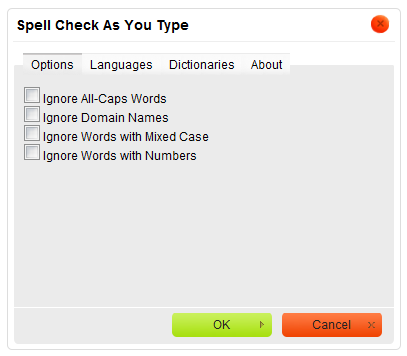 toolbar button and select the Options menu option. The Options tab of the Spell Check As You Type dialog window that will open lets you configure SCAYT settings.