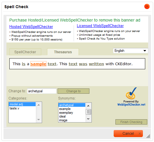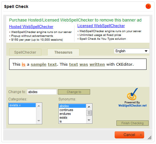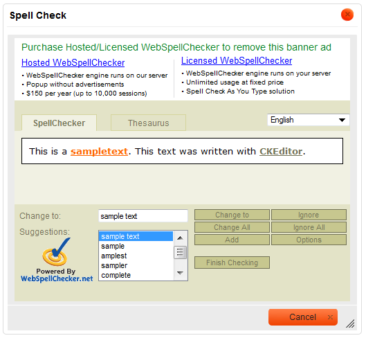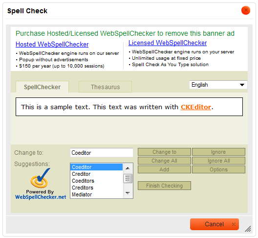 Please note that the free spell checking solution provided by WebSpellChecker.net is advertisement-supported. To remove the ads, you need to buy a license. For licensing terms check the WebSpellChecker.net website.