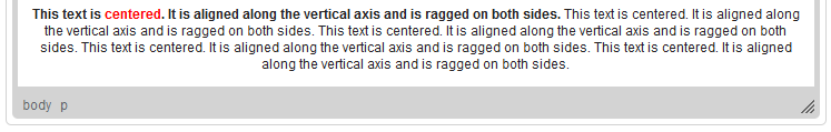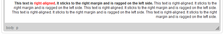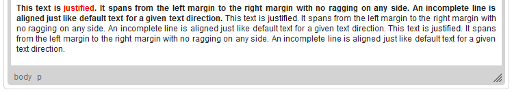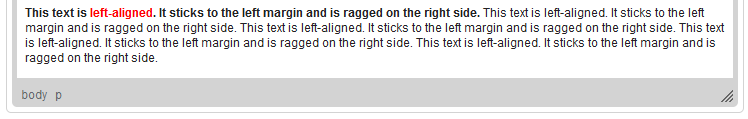 Text alignment determines the placement of text relative to the page (or the editing area). Note that due to the nature of this formatting option, text alignment can only be applied to a block-level element, like a paragraph, an image, a list item, or a div element. Most document elements have a default alignment setting that is highlighted in the toolbar. If you want to change the default alignment setting, select another option by clicking the toolbar button.